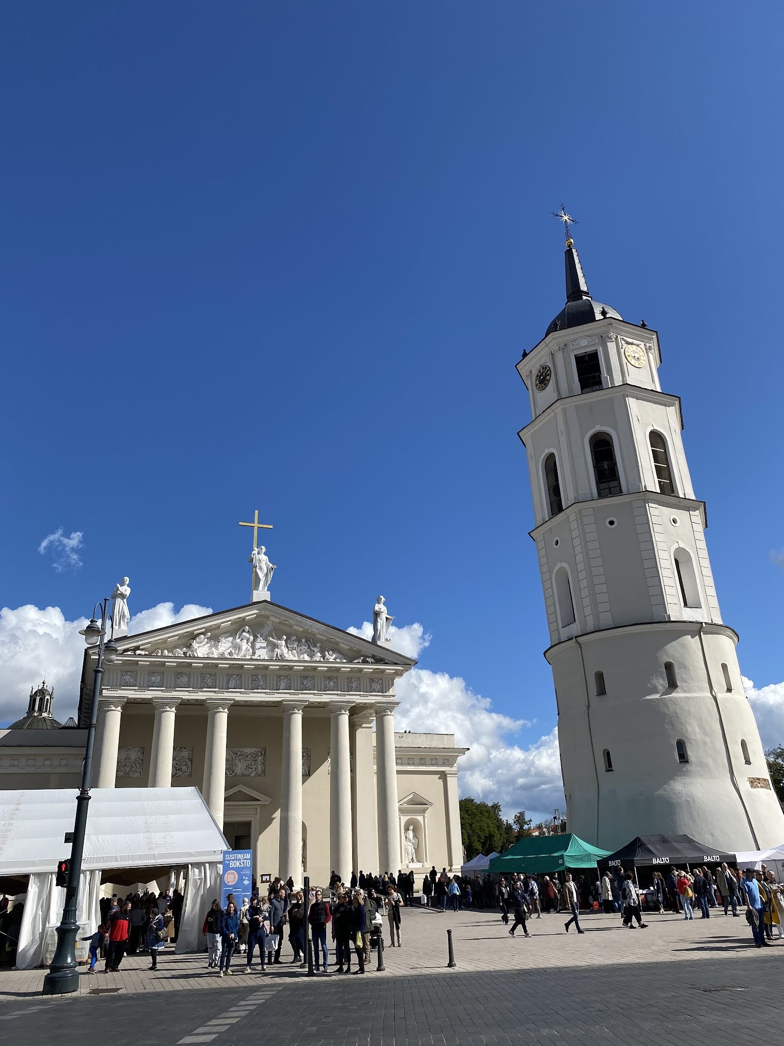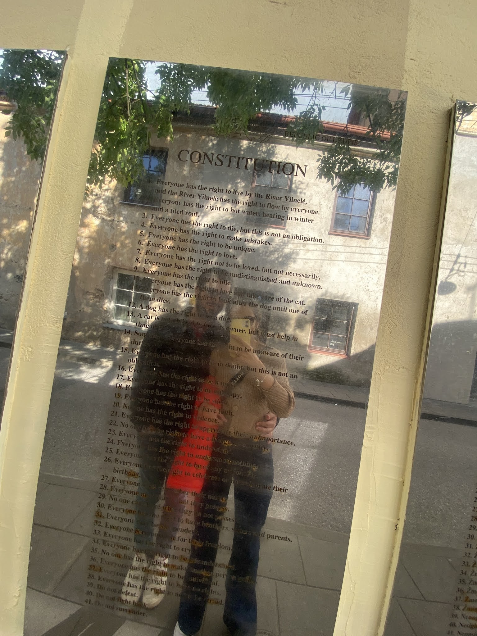 Old Town diye ifade edilen bölge kocamaan bir alanı kapsıyor, ve biz neredeyse hep bu bölgede takıldık; zaten sanırım neredeyse tüm turistik noktalar da bu bölgede. Cathedral Square zaten kabak gibi ortada, her halükarda defalarca yanından yamacından geçiyorsunuz. Bizim şansımıza bir pazar, konser etkinliği bir şeyler vardı ve haftasonu çok kalabalıktı, korona fobimiz olduğu için kalabalıktan nefesimizi tutarak uzaklaştık. Gedinimias Tower‘a (biraz yorulduğumuz ve ertesi günü işe gideceğimiz için;) füniküler ile inip çıktık, asla tembellik değildi, gücümüzü etkili kullanmaya çalıştık:D Vilnius Kalesi’nden kalan tek yapıymış epey minikti. Saçımız başımız dağıldı ve suratımız buz tuttu ama şehrin panoramik manzarasını görmeye gerçekten değdi bence. St. Anne Kilisesi‘ne kahve almaya giderken uğradık, uzun zamandır gördüğüm en gotik binaydı ve dini bir etkinliğe katıldık burada davetsizce. Pilies Sokağı da şehrin, en popüler-en tarihi-en eski sokağı imiş, burada da epey takıldık. Vee bahsetmeden yazıyı sonlandıramayacağım yer Republic of Uzupis, şehrin tam göbeğinde kendi marşı, bayrakları, anayasası olan bir bölge. Yani resmi olmayan özerk bir cumhuriyet diyebiliriz. Tabii ki bu bağımsızlık ve özerklik devlet tarafından kabul edilmiyor, nehrin üzerindeki köprüden geçiyorsunuz kocaman bir tabela ve onlarca dilde yazılmış anayasa sizi karşılıyor. Ben anayasayı sevdim, fotoğrafları ve maddeleri buraya da yapıştıracağım.