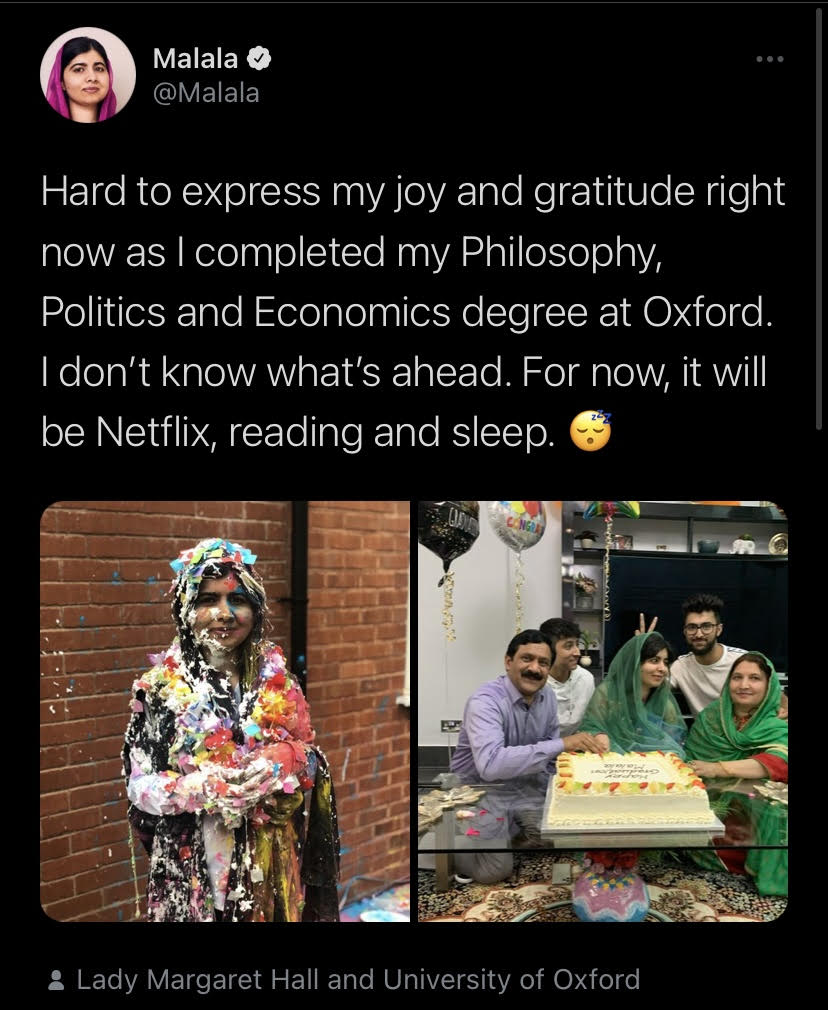 Malala 14 yaşındayken kızların okuması için yürüttüğü kampanya ve yazdıkları yüzünden başından vuruluyor. Muhtemelen vurulmasaydı dünya onu bugün tanımıyor olacaktı… (Aklıma tanık olamadığımız ama bildiğimiz nice hikayeler getiriyor.) Malala 2014 yılında Nobel Ödülü’nü alan en genç kişi oluyor. Bugün, kadın hakları ve insan hakları aktivitisti, siyasetin de epey popüler bir yüzü. Geçen sene Oxford’daki felsefe, politika ve ekonomi eğitimini tamamlamış. Paylaştığı fotoğrafta arkasında yine babası ve ailesi var;( biraz yaşlanmış adamcağız haklı olarak. Ve son olarak benzetenleri anlayabiliyorum ama, bence Benazir Butto’dan biraz daha farklı bir imajı var.